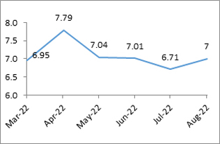 The combined Index of Eight Core Industries increased by 0.1 % in October 2022 as compared to the Index of October 2021. The production of Fertilizers, Steel, Coal and Electricity generation increased in October 2022 over the corresponding month of last year. This needs a serious attention as infrastructure development in the country is one of the most important ingredients to achieve the vision of Atamanirbhar bharat. Front loading of the allocations made in the National Infrastructure Pipeline and to speed up the projects through Gati Shakti would be crucial to enhance the infrastructure growth in the country. On the other hand, growth in industry output, as measured in terms of IIP, for the month of October 2022 stands at (-)4% as compared to 3.5% in September 2022. The overall IIP for the period Apr-Oct is 5.3%.